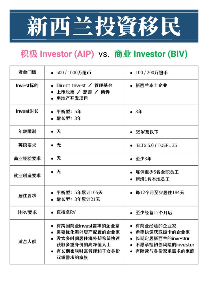 若追求身份自由、优化海外资产配置且不愿参与企业日常管理,AIP投资移民更适合;若计划长期扎根新西兰、具备商业经验并希望亲自经营企业,BIV投资移民更合适。