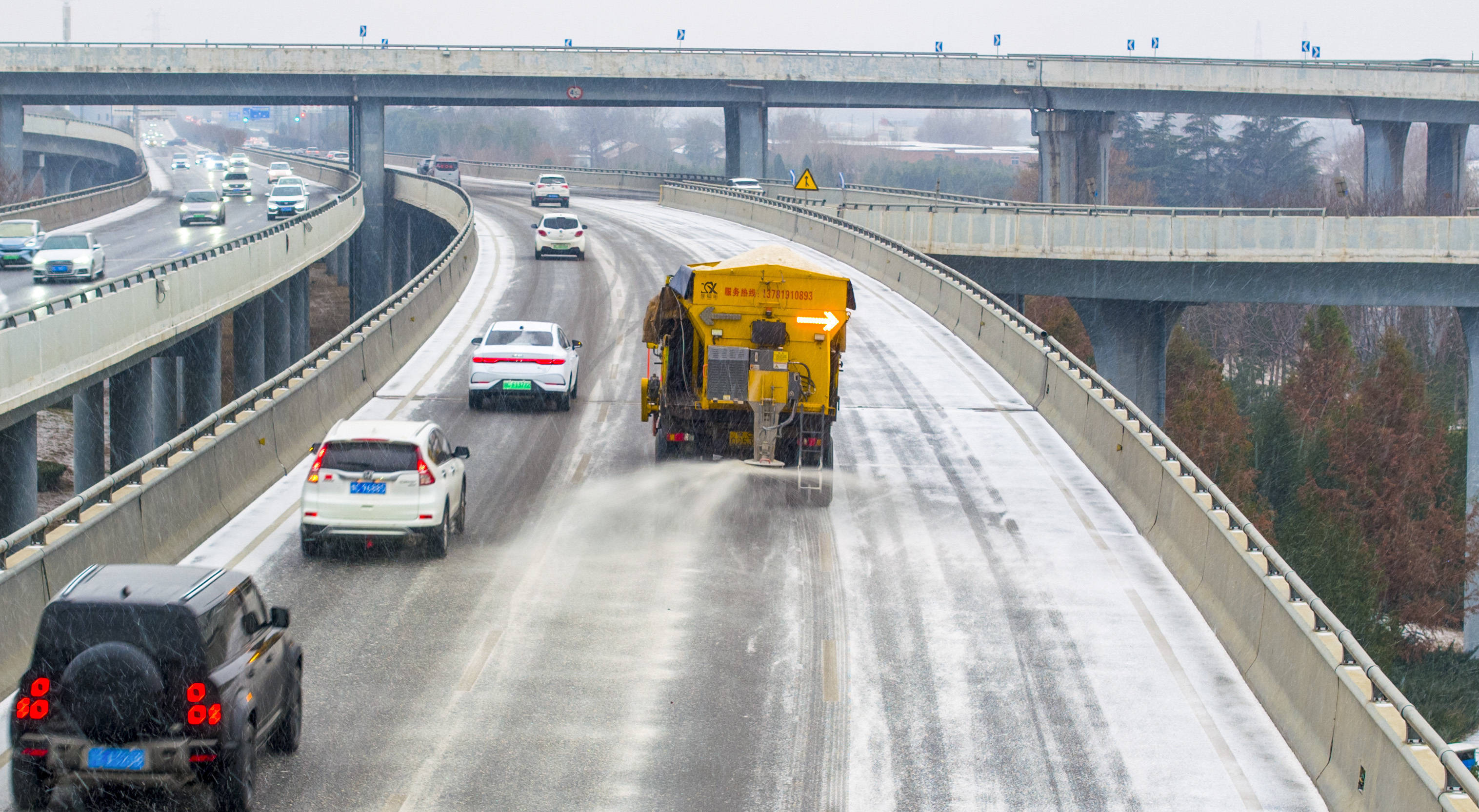 1月19日,在河南省洛阳市古王立交,市政集团车辆对道路进行撒布融雪剂作业(无人机照片)。新华社发(张怡熙摄)受强冷空气影响,19日至22日贵州省有一次大范围寒潮和冰冻天气过程。19日14时,贵州省防减救灾办启动低温雨雪凝冻灾害四级应急响应,要求交通、电力、通信等部门在重点部位预置抢险队伍和装备物资,做好抢险救援和救灾救助准备。