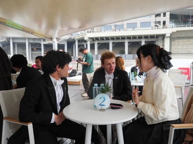游轮甲板上,合唱团成员与重庆留学生代表、中小学生代表以及重庆大剧院爱乐童声合唱团的孩子们结成交流小组,围绕火锅、8D交通、巴渝非遗等趣味话题畅谈互动,重庆少年们的多才多艺、中外青年的思维碰撞,让这场游轮的文化交流更具温度与活力。